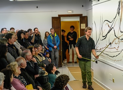 ![]() | Miquel Veny abans de començar va explicar al nombres públic assistent, que l’acte consistiría en generar una partitura gràfica en directe que funcionava com un diàleg entre el so i la línia. |