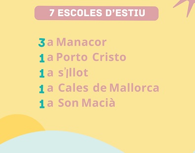 Aquest projecte té com a objectiu oferir un espai de diversió i aprenentatge per als infants i joves, fomentant valors com la convivència, la inclusió i el respecte per l’entorn. Les escoles d’estiu es duran a terme a Manacor, Porto Cristo, s’Illot, Cales de Mallorca i Son Macià, amb la següent distribució: